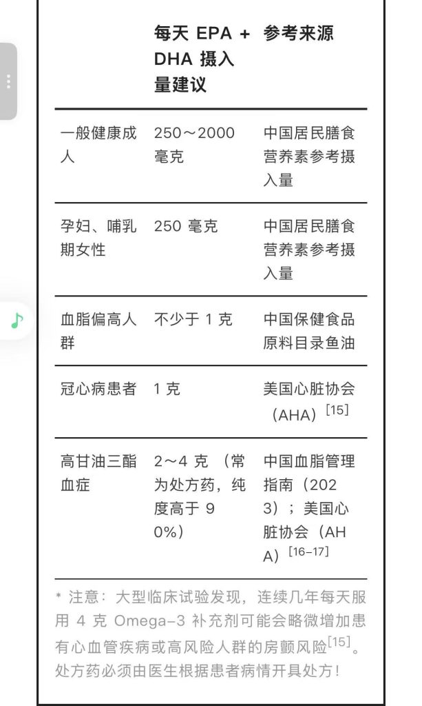 不同人群的推荐摄入量不同(详见前文),普通成人不建议每天超过 2 g的 EPA 和 DHA,因为可能造成出血的风险增加。