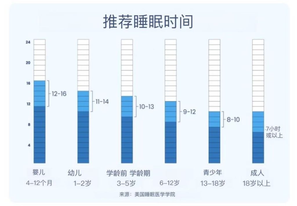 以下是美国儿科学会和美国睡眠医学会推荐的各年龄段儿童的睡眠时长: