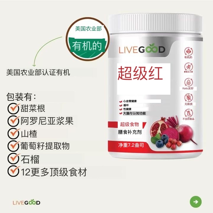 USDA有机认证的超级红 – 莓果饮,富含抗氧化物 ,包含甜菜根粉 – 可帮助血管产生一氧化氮,对血管健康维护,超级好的一种产品。更是含有19种 超级有机食物 -每一种都有对身体有莫大的好处 – 维护心脑血管健康 推荐选品。会员售价仅18USD。 超级无敌性价比。