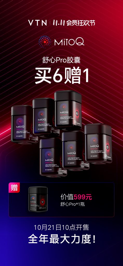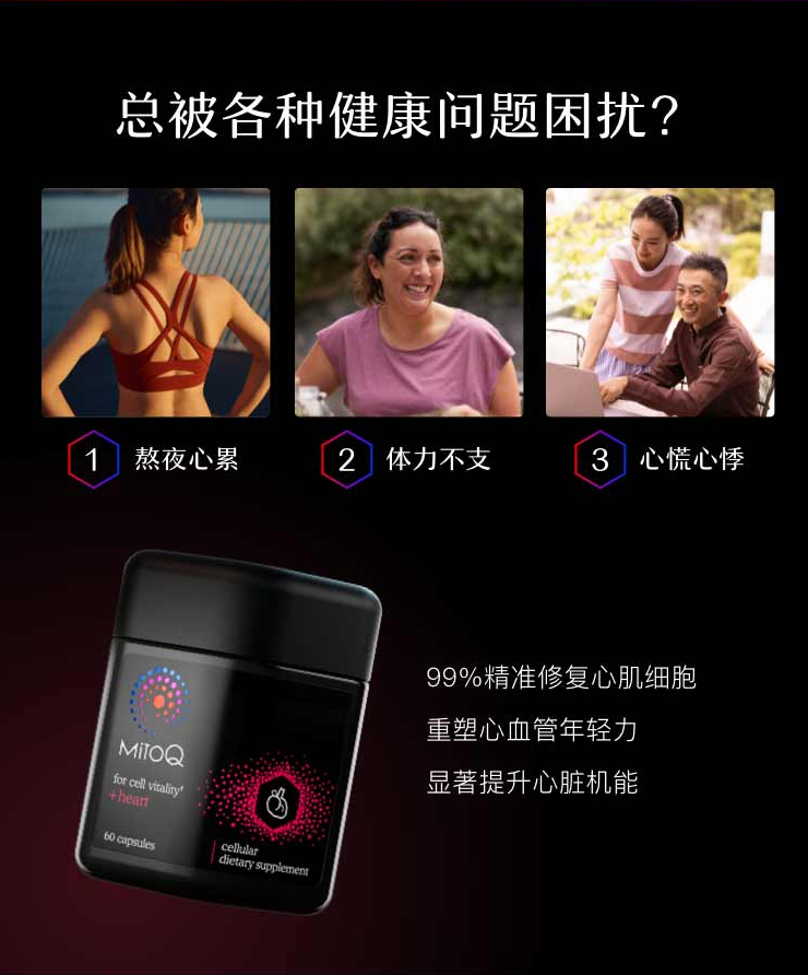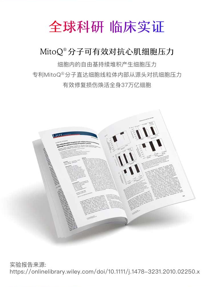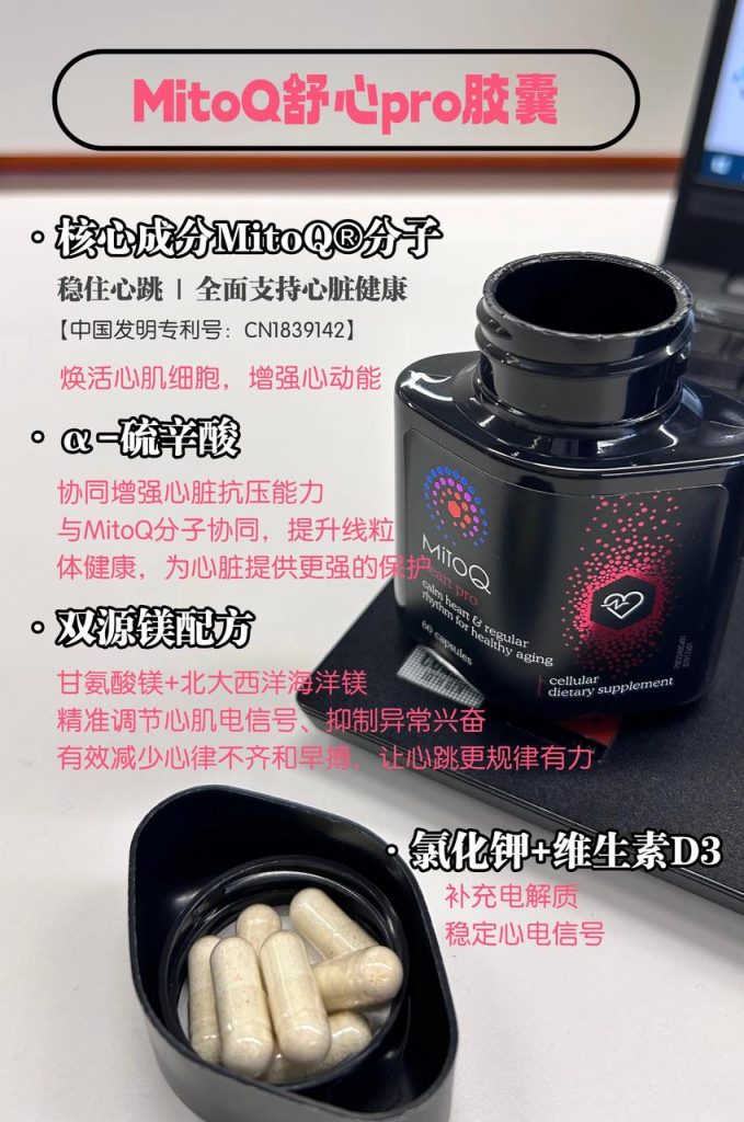 MitoQ+舒心Pro现代都市人群常因高压工作、情绪波动,出现心悸、早搏、胸闷等“压力型心律不齐”问题。舒心Pro依托MitoQ®专利抗衰分子,靶向深入线粒体为心肌细胞充能,大幅提高动脉血管扩张能力42%,下调低密度脂蛋白13%;