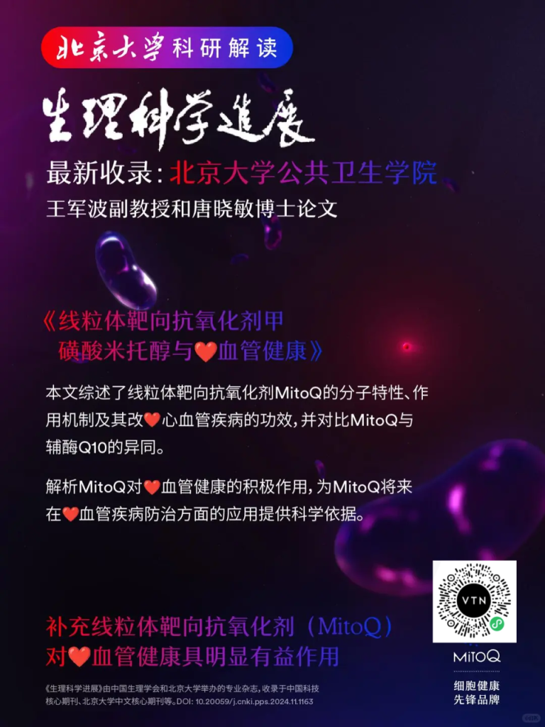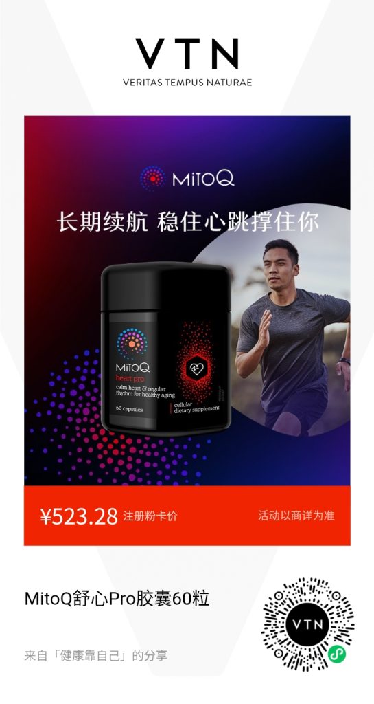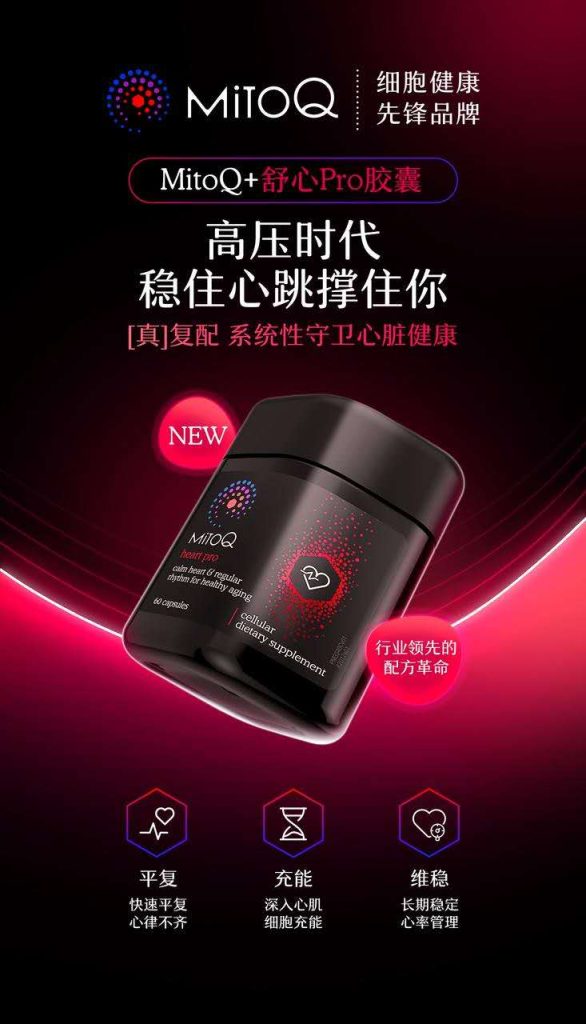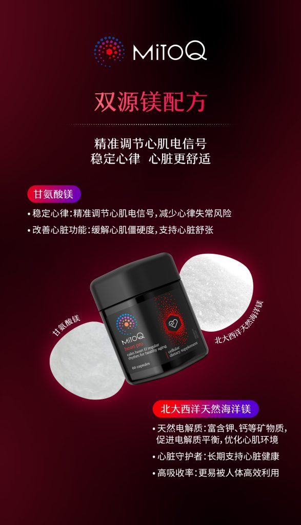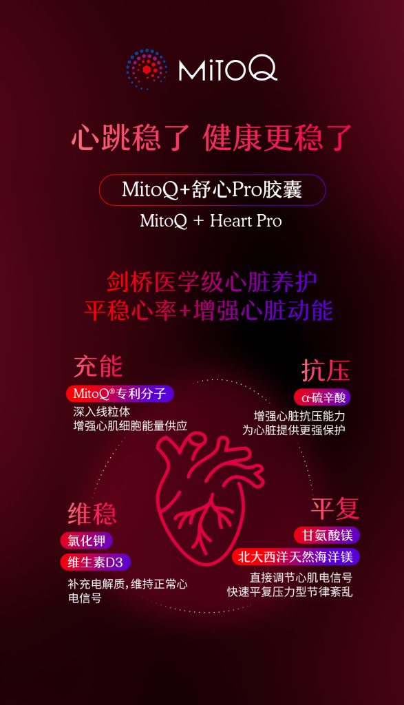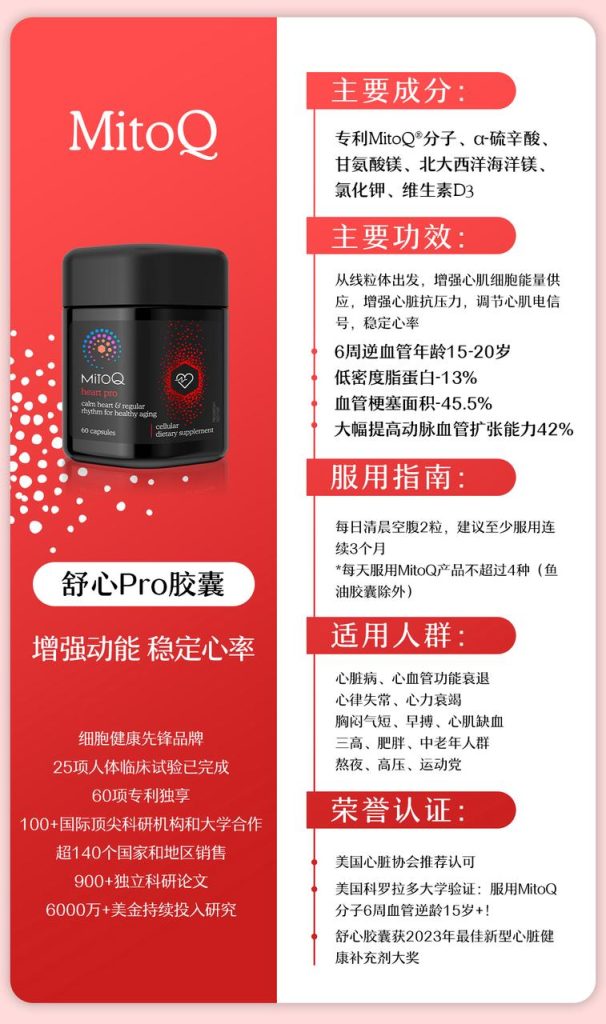 舒心pro胶囊 MitoQ+舒心Pro现代都市人群常因高压工作、情绪波动,出现心悸、早搏、胸闷等“压力型心律不齐”问题。舒心Pro依托MitoQ®专利抗衰分子,靶向深入线粒体为心肌细胞充能,大幅提高动脉血管扩张能力42%,下调低密度脂蛋白13%; 同时舒心Pro把此前单一镁替换为优质双源镁:添加甘氨酸镁和天然海洋镁,新增高纯α-硫辛酸、氯化钾及维生素D3,复配后打通从线粒体到心脏以及血管的三维链路,达到为线粒体供能、维持心脏健康节律、促进血管通畅的三效合一。