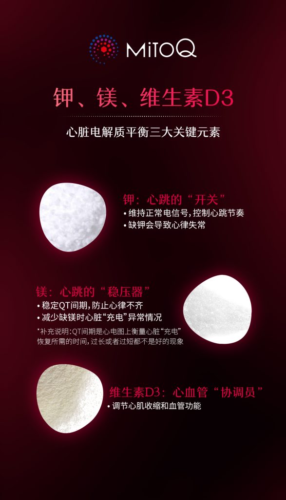 MitoQ®分子结合经研究证明的有效成分α-硫辛酸、复合镁、钾及维生素D3,共同增强机体对抗氧化应激的天然防御力,支持细胞能量代谢。其科学配方有助于维持心脏节律稳定、促进血液循环、支持正常胆固醇水平及健康血压。