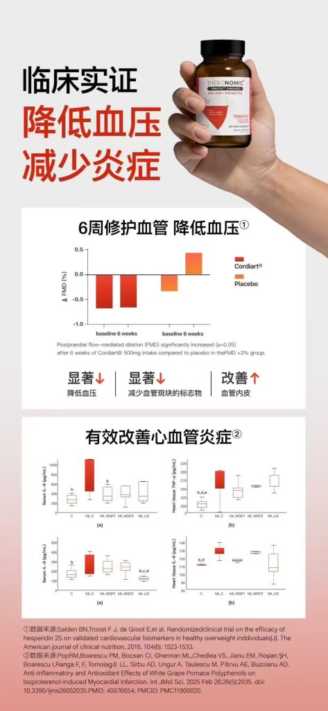 - 专利甜橙提取物Cordiart®:促进一氧化氮 (NO) 产生,来促进血管舒张、恢复血管柔韧度,从而调节血压